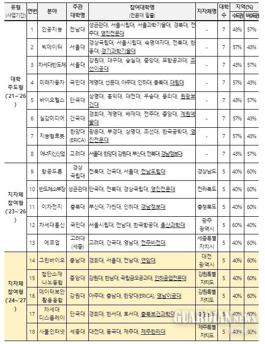 가디언뉴스 이은하 기자 | 교육부와 한국연구재단(이사장 이광복)은 '첨단분야 혁신융합대학(COSS)' 사업의 ‘지자체참여형’ 신규 분야 연합체(컨소시엄) 선정 결과를 5월 22일에 발표한다.