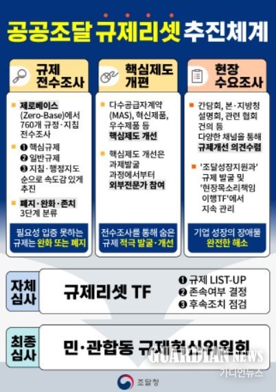 가디언뉴스 백승진 기자 | 조달청은 조달청 소관 760여개 규정과 지침, MAS·우수제품·혁신제품 등 주요제도를 A부터 Z까지 원점에서 전면 재검토하는 '공공조달 규제리셋'을 추진한다.