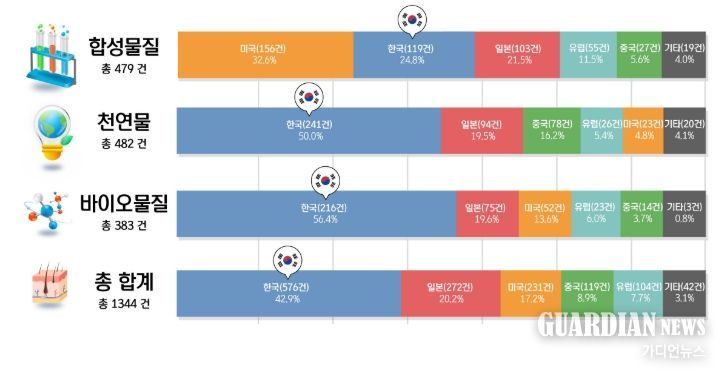성분 유형별로는 ㈜아모레퍼시픽이 천연물 분야 1위(40건), ㈜케어젠이 바이오 물질 분야 1위(115건)를 차지해 천연물·바이오 물질 분야에서 우리 기업의 우위를 확인할 수 있었다.
