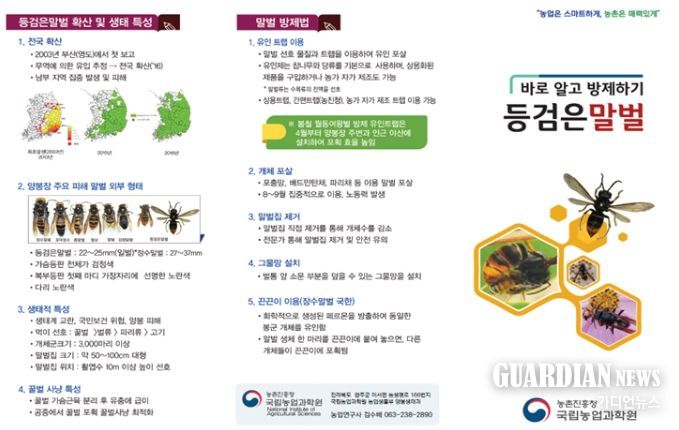 가디언뉴스 백승진 기자 | 농촌진흥청은 등검은말벌로 인한 꿀벌 피해를 줄이기 위해 월동한 등검은말벌 여왕벌이 활동하는 3월 하순부터 5월까지 등검은말벌 방제에 힘써 달라고 당부했다.