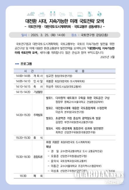 가디언뉴스 백승진 기자 | 국토교통부는 대한국토‧도시계획학회, 국토연구원과 함께 국토의 지속가능한 발전을 위한 발전전략을 모색하기 위한 공동 세미나를 3월 25일 오후 국토연구원(세종)에서 개최한다.