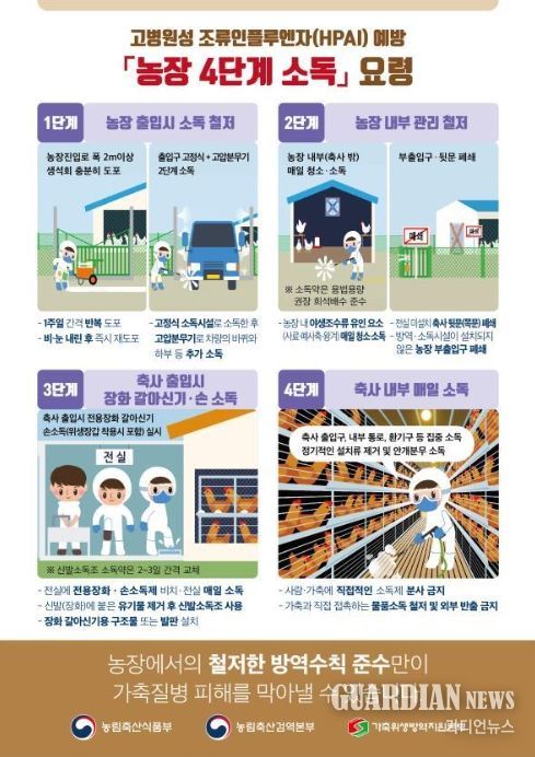 중수본은 바이러스 접촉 가능성이 있는 철새도래지 등 출입을 삼가고, 농장 출입 차량 2단계 소독(고정식소독기 및 고압분무기 소독), 계란 운반차량의 농장 내 진입 금지, 축사 출입 전 전용 장화 갈아신기, 기계·장비 등을 축사 내 반입 시 세척 및 소독조치 등 기본적인 방역수칙을 철저히 준수해 줄 것을 강조했다.