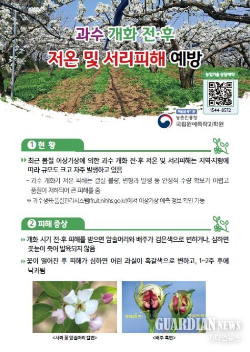 가디언뉴스 백승진 기자 | 농촌진흥청은 올해 과일나무 꽃이 활짝 피는 ‘만개(滿開) 시기’가 평년과 비슷하거나 빨라질 전망이라며, 지역 간 편차가 크고 최근 기상 변동이 심한 만큼 각별한 주의를 당부했다.