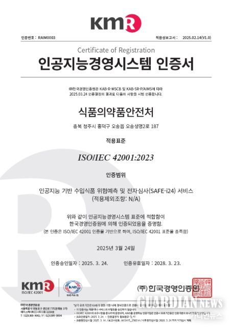 가디언뉴스 백승진 기자 | 법제처와 식품의약품안전처는 안전성에 문제가 없는 수입식품을 자동으로 검사·신고수리하는 ‘수입식품 위험예측 및 전자심사(SAFE-i24)’ 시스템에 대해 정부 기관 최초로 인공지능경영시스템(ISO/IEC 42001) 인증을 취득했다고 밝혔다.