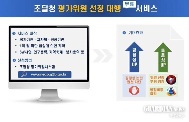 가디언뉴스 백승진 기자 | 조달청은 수요기관의 평가위원회 구성 부담을 해소하기 위해 평가위원 선정 대행 서비스를 31일부터 지자체·공공기관 등 전 기관으로 확대 시행한다.