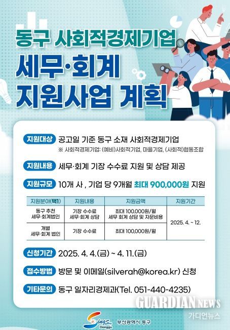가디언뉴스 김기홍 기자 | 부산광역시 동구는 지역 내 사회적경제기업의 지속가능한 성장과 건전한 경영환경 조성을 위해 ‘동구 사회적경제기업 세무·회계 지원사업’을 추진한다고 3월 31일 밝혔다.