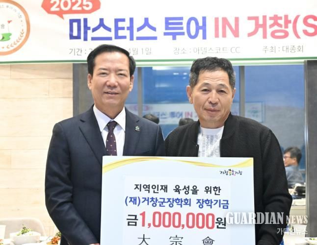 가디언뉴스 김기홍 기자 | (재)거창군장학회는 지난 31일 지역인재 육성을 위해 대종회(大宗會)에서 ‘2025 마스터스 투어 In 거창(Spring)’ 경기 중 회원들이 모은 성금 100만 원을 장학회에 기탁했다고 밝혔다.