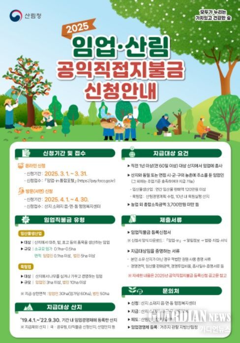 가디언뉴스 김기홍 기자 | 산림청은 4월 한 달간 '2025년 임업‧산림 공익직접지불금' 방문 신청접수를 시작한다고 1일 밝혔다.