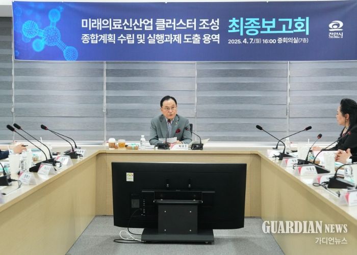 가디언뉴스 김기홍 기자 | 천안시는 7일 시청 중회의실에서 ‘미래의료 신산업 클러스터 조성 종합계획 수립 및 실행과제 도출 용역’ 최종보고회를 개최했다.