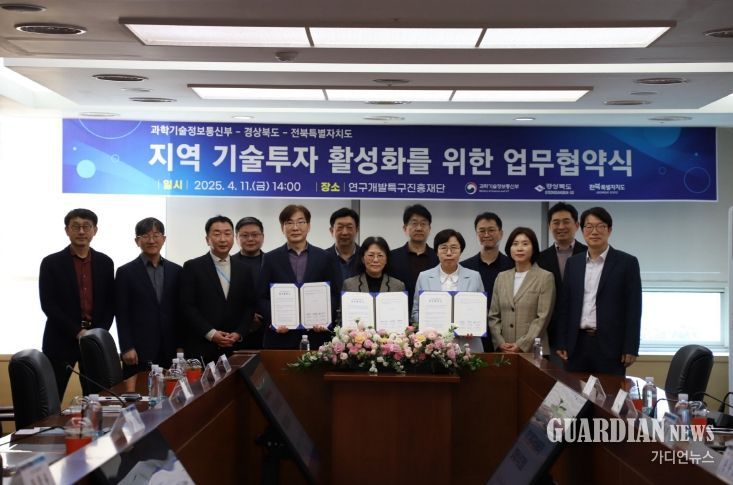 가디언뉴스 김기홍 기자 | 전북특별자치도는 과학기술정보통신부와 경상북도와 함께 11일 대전 연구개발특구진흥재단에서 ‘지역 기술투자 활성화를 위한 업무협약(MOU)’을 체결하고, 지역 기술기업에 대한 투자 활성화 방안을 모색하기 위한 간담회를 개최했다.