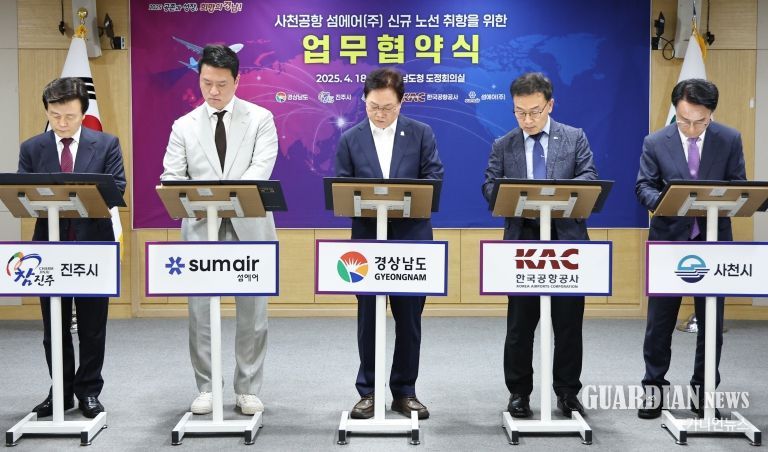 가디언뉴스 김기홍 기자 | 경상남도는 18일 도청 도정회의실에서 소형항공사 섬에어㈜와 업무협약을 체결하고, 사천공항 활성화와 도민의 항공교통 편의 증진을 위한 본격적인 협력에 나섰다.