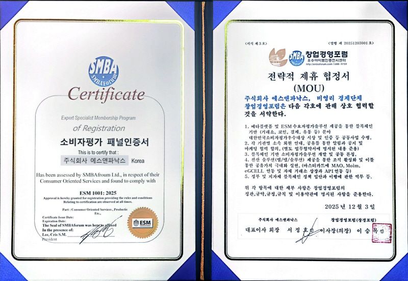 또한 12월3일 .(주)에스앤파낙스(서정호 대표)는 대한민국 소비자평가 단체 창업경영포럼과 전략적제휴 및 우수기업으로 인증 받으며 글로벌 시장으로 발돋움하는 계기를 마련했다.