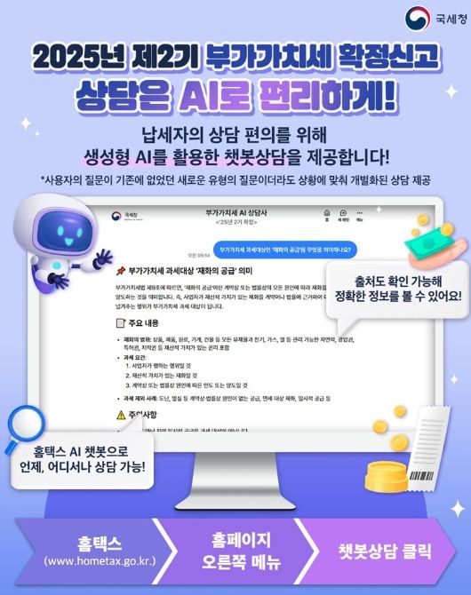 가디언뉴스 허요셉 기자 | ■ 2025년 제2기 부가가치세 확정신고 상담은 AI로 편리하게! 납세자의 상담 편의를 위해 생성형 AI를 활용한 챗봇상담을 제공합니다! *사용자의 질문이 기존에 없었던 새로운 유형의 질문이더라도 상황에 맞춰 개별화된 상담 제공