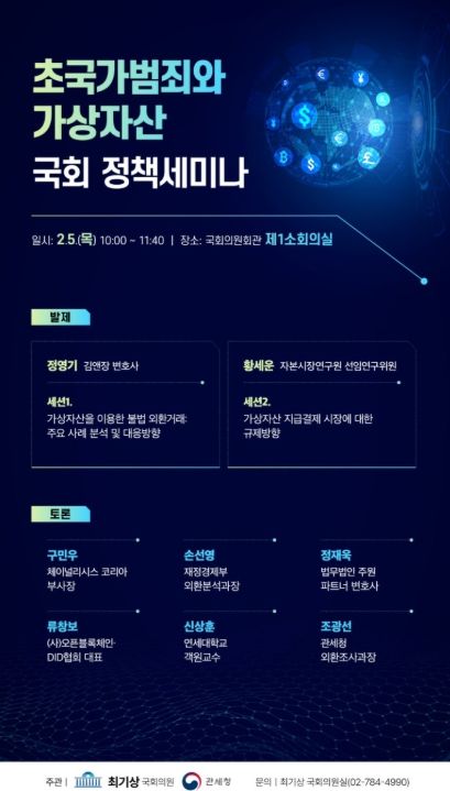 최기상 의원은 “가상자산이 초국가범죄의 새로운 통로로 진화하고 있다는 점은 더 이상 부인하기 어려운 현실”이라며 “오늘 논의가 안전하고 건전한 가상자산 거래질서를 만드는 소중한 밑거름이 되기를 바란다”고 했다.