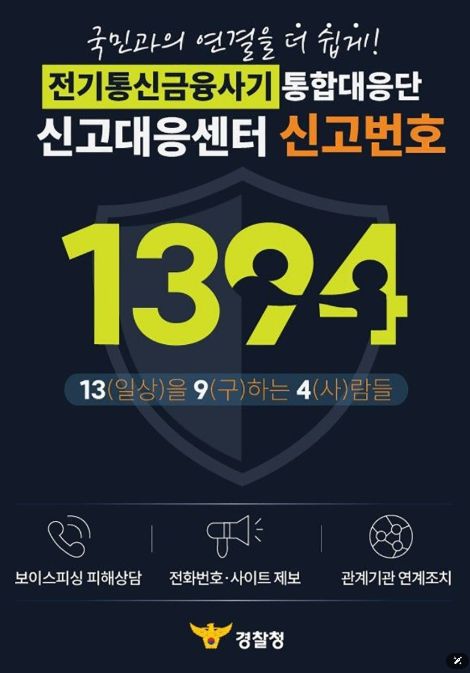 가디언뉴스 허요셉 기자 | 국민과의 연결을 더 쉽게! 전기통신금융사기 통합대응단 신고대응센터 신고번호 ☎1394 13(일상)을 9(구)하는 4(사)람들 - 보이스피싱 피해상담 - 전화번호·사이트 제보 - 관계기관 연계조치