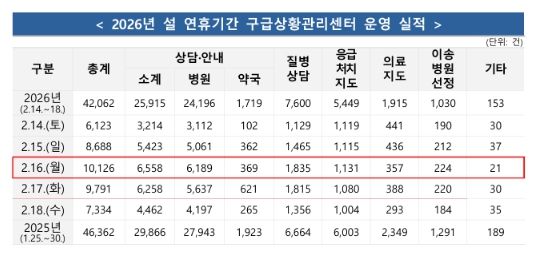 가디언뉴스 김진택 기자 | 소방청은 2026년 설 연휴 기간(2.14.~2.18., 5일간)전국 총 45,082건의 구급 출동으로 24,166명을 이송하였으며, 구급상황관리센터에서 총 42,062건의 상담을 실시했다고 밝혔다.