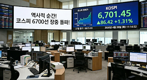 가디언뉴스 김재한 기자 | 대한민국 자본시장이 역사적인 분기점을 통과하며 새로운 지평을 열었다. 오늘 국내 증시는 코스피 지수가 사상 최초로 6,700선을 돌파하며 전례 없는 고지에 발을 들였다.