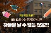 가디언뉴스 허요셉 기자 | 하늘을 날 수 없는 것들은? ■ 전면 통제대상 · 모든 항공기 이륙 금지 (비행 중 항공기 → 3km 이상 상공에서 대기) · 헬기 · 경량항공기 그리고 초경량 비행장치(드론 포함) 모두 STOP! * 예외: 비상·긴급 항공기 영어 듣기평가에 방해가 되는 '항공기소음 최소화' ■ 언제 통제되나요? 11월 13일(목) 13:05~13:40(총 35분) ※ 듣기평가 전·후 5분 포함 수험생에게 조용한 하늘을! 국민 여러분의 협조를 부탁드립니다.