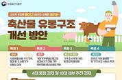 가디언뉴스 허요셉 기자 | ■ 소비자 부담은 줄이고 생산자 소득은 올리는 '축산물 유통 구조 개선 방안' (목표 1) 한우 - 사료 유통비용 각각 10% 절감 및 도소매 가격 연동성 강화 (목표 2) 돼지 - 거래가격 투명성 제고 및 삼겹살 규격 강화, 기후 변화 대응 생산성 향상 지원 (목표 3) 닭고기·계란 - 가격 조사 체계 개편 및 등급제 활성화 (목표 4) 온라인 - 온라인 거래 활성화 및 가격 비교 서비스 확대 ■ 4대 중점 과제 및 10대 세부 추진 과제 01. 한우 유통 효율화 및 사육 방식 개선 - 한우 유통 효율화(농협) 및 직거래 확산 - 한우고기 판매장 유형별 소·도매가격 연동성 강화 - 한우 사육 방식 개선 및 단기 비육 한우고기 유통 02. 돼지 거래가격 투명성 강화 및 삼겹살 규격 강화 - 경매 물량 확대 및 거래가격 수집·제공 - 삼겹살 규격 강화 및 부위 세분화 - 돼지 생산 관리 인증제 도입 및 기후변화 대응 생산성 향상 지원 03. 닭고기·계란 가격 조사 개선 및 계란 등급제 활성화 - 닭고기·계란 가격 조사 체계