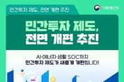 가디언뉴스 허요셉 기자 | AI·에너지·생활 SOC까지 민간투자 제도가 새롭게 개편됩니다! 1. 민간투자 제도란? 사회 기반 시설에 대한 민간의 투자를 촉진하여 창의적·효율적으로 사회기반시설을 확충·운영하는 제도 제도 도입 이후 30년 동안 총 872개 사업, 약 154조 원 규모의 민자사업 추진 → AI 등 신산업 분야, 노후시설 성능 개선 등 급증하는 투자 수요에 대응하기 위해서는 재정과 민간투자의 병행이 필수! 2. 이렇게 달라집니다. - 신사업·신유형 확대 - 국민 참여 확대 및 국민 생활 편익 증진 - 지방의 민자 활성화 및 민자사업의 안전 강화 - 절차 단축 등 사업 추진 여건 개선 4대 분야 20개 과제 마련으로 '민간투자의 패러다임 전환' 3. ① 신사업·신유형 확대 AI 데이터센터, 전력망, 철도 복합 시설 등 신산업·신유형 분야에 민간투자 활용 전통적 SOC(도로·철도 등)에서 벗어나 신산업 분야에도 민자 방식을 도입하고, 단순 운영형 민자 신설, 대상지 공모 방식 개선 등으로 신유형 사업 방식을 활성화합니다. ② 국민 참여 확대 및 편익 증진 일반 국민이