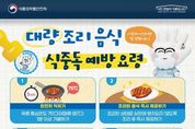 가디언뉴스 허요셉 기자 | ■ 대량 조리 음식 식중독 예방요령 ① 완전히 익히기 육류 중심온도 75°C(어패류 85°C) 1분 이상 가열하기 ② 조리된 음식 즉시 제공하기 조리된 상태로 상온에 방치되지 않도록 조리 후 즉시 제공하기 ③ 가열 조리 후 신속히 냉각하기 가열 조리 후 즉시 섭취하지 않을 시, 여러 용기로 나누어 담거나 신속히 냉각하기 ④ 보관온도 유지하기 따뜻한 음식은 60°C 이상, 차가운 음식은 5°C 이하로 보관하기 ⑤ 재가열하여 섭취하기 보관된 음식 섭취 시, 충분히 가열 후 섭취하기 ■ 운반 시 식중독 예방 요령 · 차량·운반기구 청결히 관리하기 - 오염되기 쉬운 곳 세척·소독하고 청결 상태 수시로 확인하기 · 운반 시 음식 온도 관리 주의 - 따뜻한 음식과 차가운 음식이 서로 닿지 않게 구분하기 · 안전하게 포장하기 - 음식이 새거나 오염되지 않도록 완전히 밀폐되게 포장하기 · 운반 후 즉시 제공하기 - 음식 운반이 완료되면 즉시 제공하기