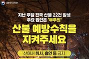 가디언뉴스 허요셉 기자 | 지난 주말 전국 산불 22건 발생 주요 원인은 '부주의' 산불 예방수칙을 지켜주세요 · 산에서 취사, 흡연 등 금지 · 산 근처에서 쓰레기 소각 금지 · 연기, 불씨 보면 119 신고 "불법소각, 꽁초 투기 등 위반 행위 엄정 대응"