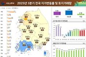 가디언뉴스 김기홍 기자 | 국토교통부와 한국부동산원(원장 손태락)은 '25년 3분기 지가변동률 및 토지거래량을 발표했다. ★ 지가변동률 '25년 3분기 전국 지가는 0.58% 상승했다. 상승폭은 '25년 2분기(0.55%) 대비 0.03%p 확대, '24년 3분기(0.59%) 대비 0.01%p 축소된 것으로 나타났다. '25년 9월 지가변동률은 0.20%로, '25년 8월(0.19%) 대비 0.01%p, '24년 9월(0.19%) 대비 0.01%p 높은 수준으로 나타났다. (지역별) '25년 3분기 지가변동률은 수도권(0.74% → 0.80%)은 '25년 2분기 변동률 대비 높은 수준, 지방권(0.22% → 0.19%)은 낮은 수준을 보였다. (시·도) 17개 시·도 중 서울(1.07%)이 전국 평균(0.58%)을 상회했다. (시·군·구) 서울 용산구 1.96%, 서울 강남구 1.68%, 서울 서초구 1.35% 등 252개 시군구 중 40개 시군구가 전국 평균을 상회했다. 또한, 252개 시군구 중 199개 시군구가 0.00% ~ 0.80% 수준을 나타내었으며, 주로 수도권