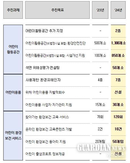 어린이가 자주 활동하는 시설의 환경을 안전하게 관리하기 위해 어린이활동공간 소관부처(교육부, 보건복지부 등)와 합동조사 및 개선대책을 마련하고, 어린이활동공간의 환경안전 진단과 시설개선 지원을 확대(진단 : 500개소(‘23)→1,300개소(’24), 개선 : 100개소(‘23) → 850개소(’24))할 예정이다. 또한, 관리 대상 어린이활동공간을 추가 검토하고 어린이 석면건축물 안전관리도 강화한다.