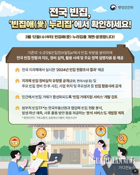 가디언뉴스 백승진 기자 | 전국 빈집 현황을 쉽게 확인하고 활용 방안을 공유할 수 있도록 3월 12일(수)부터 빈집애(愛) 누리집을 개편·운영합니다!