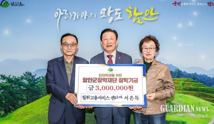 가디언뉴스 김기홍 기자 | 서은득 칠원 고용서비스 센터장은 지난 2일 함안군장학재단을 방문해 지역인재 육성을 위한 장학기금 300만 원을 기탁했다.