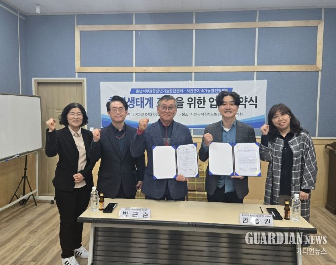 가디언뉴스 김기홍 기자 | 서천군지속가능발전협의회와 충남서부권 중장년기술창업센터는 9일 SDGs(지속가능한 발전목표) 기반의 중장년 대상 창업지원, 인재발굴육성과 상호간의 협력관계 구축을 위해 서천지속협 회의실에서 업무 협약식을 가졌다.