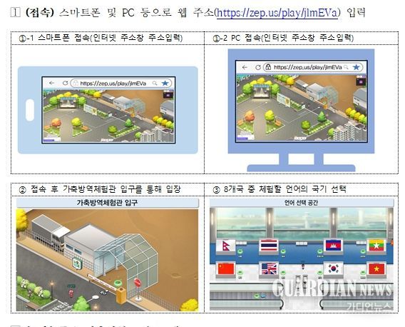 '가상농장 가축방역 교육프로그램'은 스마트폰이나 컴퓨터에서 별도의 프로그램 내려받기 없이 인터넷 주소창에 'https//zep.us/play/jlmEVa 만을 입력하면 접속할 수 있으며, ①공항만 입국 시 검역 준수 사항 ②축종별(소·돼지·가금) 방역요령 ③의심 증상 발견 시 신고 요령 ④외부 차량·사람 소독 방법 등을 언제 어디서든 쉽고 재미있게 학습할 수 있다.