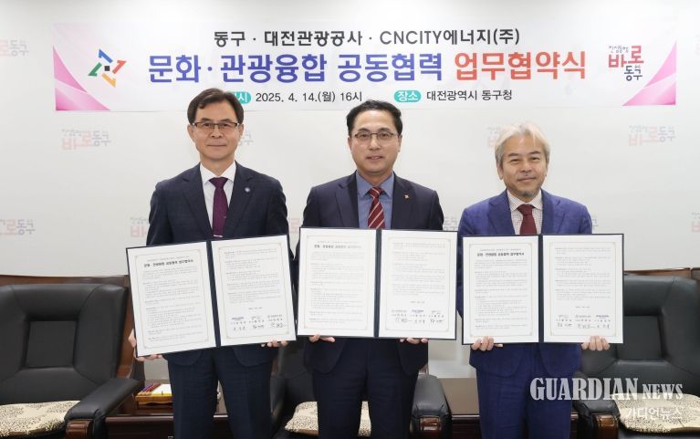 가디언뉴스 김기홍 기자 | 대전 동구는 대전관광공사, CNCITY에너지(주)와 함께 원도심 문화·관광 경쟁력 강화 및 활성화를 위한 3자 간 업무협약을 체결했다고 14일 밝혔다.