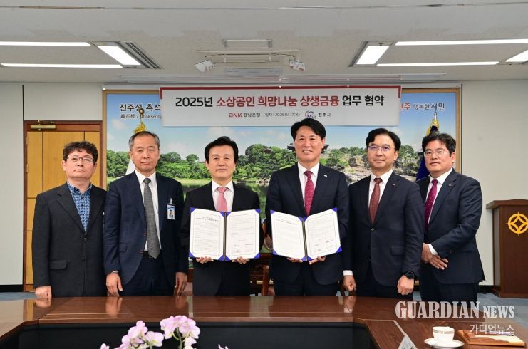 가디언뉴스 김기홍 기자 | 진주시는 17일 시청 기업인의 방에서 BNK경남은행과 담보력이 부족한 금융 취약계층 소상공인에 대한 맞춤형 금융지원을 위해 ‘소상공인 희망나눔 상생금융 업무 협약’을 체결했다.