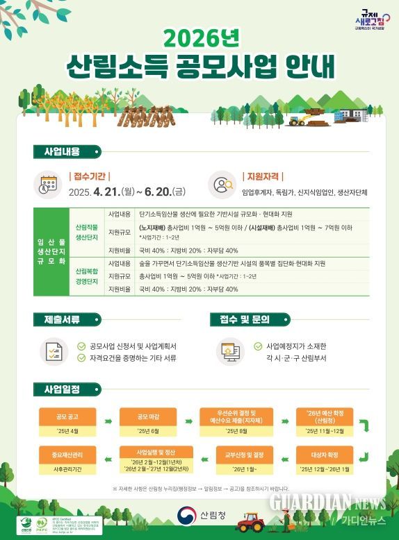 가디언뉴스 김기홍 기자 | 산림청은 단기소득임산물 생산에 필요한 기반 시설의 규모화 및 현대화를 지원하기 위해 ‘2026년 임산물 생산기반조성 공모사업’을 추진한다고 18일 밝혔다.