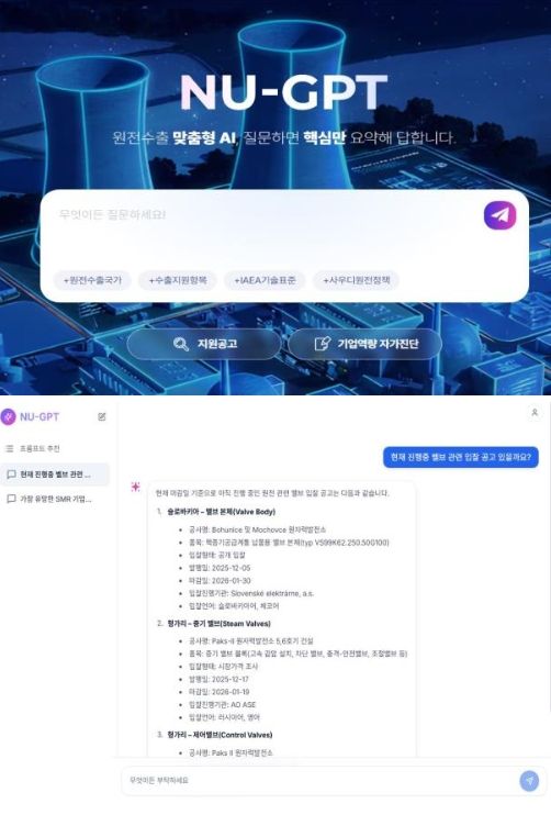 ‘NU-GPT’는 2022년부터 축적한 해외입찰·요건 정보, 발주계획, 세계시장 뉴스와 국제원자력기구(IAEA)·경제협력개발기구(OECD)·세계 원자력협회(WNA) 출간 보고서 등 1만여 건을 학습하여 개발됐다. 기업들은 NU-GPT에 질문만 하면 수많은 자료를 확보·분석하지 않고도 심도있는 시장정보와 인사이트를 얻게 돼 수출 전문인력을 채용한 효과를 누릴 것으로 기대된다.