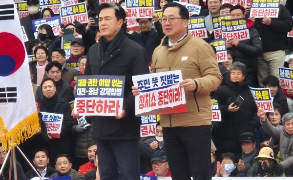 이날 집회 현장에는 이장우 대전시장과 김태흠 충남도지사를 비롯해 성일종 국회 국방위원장, 강승규 국민의힘 충남도당위원장 등 지역 정계 거물들이 총출동해 힘을 실었다. 특히 이장우 시장과 김태흠 지사는 선거법 위반 소지를 피하면서도 단호한 메시지를 전달하기 위해 '침묵의 피켓 시위'를 선택했다. 두 단체장은 궂은 날씨 속에서도 시도민 곁을 지키며 ‘행정통합 반대’ 피켓을 든 채 감사의 인사를 전해, 이번 사안에 대한 지역 사회의 엄중한 경고를 대내외에 알렸다.