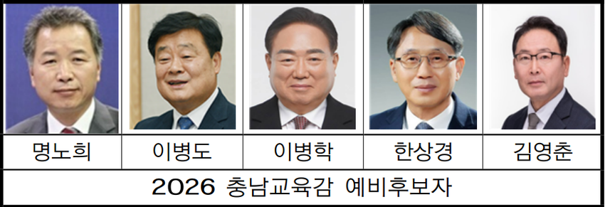 가디언뉴스 김재한 기자 | 김지철 현 충남교육감의 3선 제한으로 ‘무주공산’이 된 2026년 충남교육감 선거가 본격적인 레이스에 돌입했다. 충남선거관리위원회에 따르면 현재까지 예비후보 등록을 마친 인물은 총 5명으로, 교육계의 수장 자리를 놓고 치열한 각축전이 예상된다.