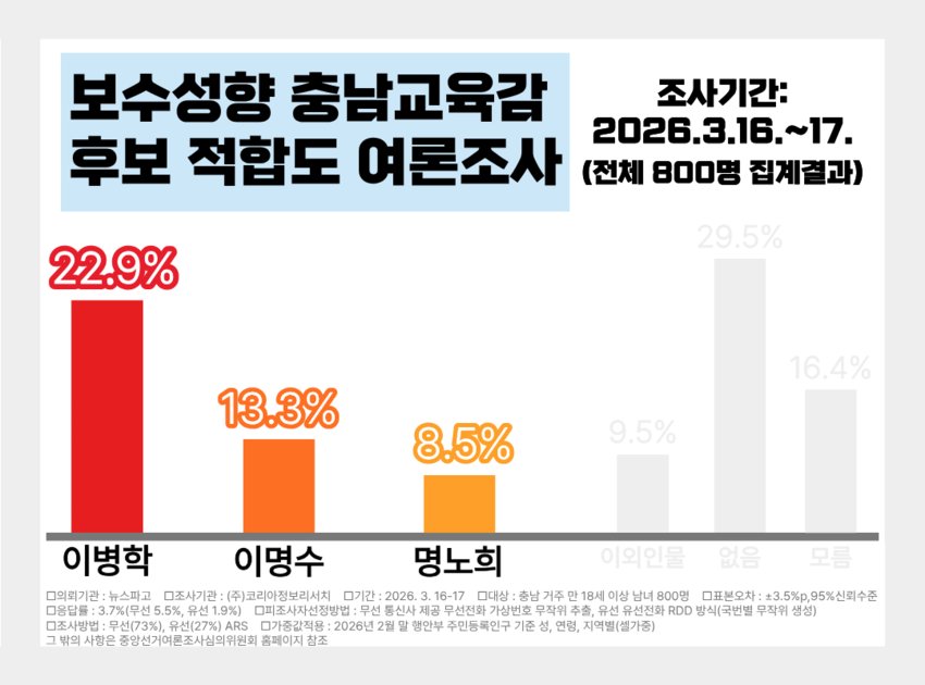 뉴스파고가 코리아정보리서치에 의뢰해 지난 3월 16일부터 17일까지 충남도민 800명을 대상으로 실시한 조사 결과에 따르면, 보수 성향 교육감 후보 적합도에서 이병학 예비후보는 22.9%를 얻어 선두를 차지했다. 이는 2위인 이명수 전 오송첨단의료산업진흥재단 이사장(13.3%)과 3위 명노희 전 신성대학교 초빙교수(8.5%)를 오차범위 밖에서 크게 앞선 수치로, 보수 진영 내에서 이 예비후보의 경쟁력이 독보적임을 입증한 결과로 풀이된다.