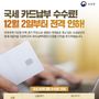 가디언뉴스 허요셉 기자 | 국세 카드납부 수수료! 12월 2일부터 전격 인하! 민생경제 지원을 위해 경기 부진으로 경영상 어려움을 겪고 있는 소상공인과 영세사업자를 지원하고자 국세 납부대행수수료율 인하를 추진하였습니다. ■ 국세 납부대행 수수료 인하 · 영세사업자의 부가가치세·종합소득세 - 신용카드 (현행) 0.8% → (인하) 0.4% - 체크카드 (현행) 0.5% → (인하) 0.15% · 일반* - 신용카드 (현행) 0.8% → (인하) 0.7% - 체크카드 (현행) 0.5% → (인하) 0.4% *단, 연간 총수입금액 1천억 원 이상 납세자는 현행 유지