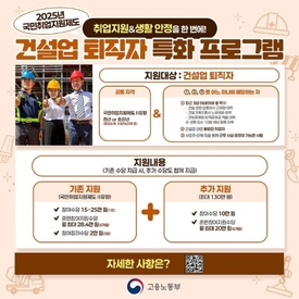 고용노동부, 취업지원과 생활 안정을 한 번에! '건설업 퇴직자 특화 프로그램'